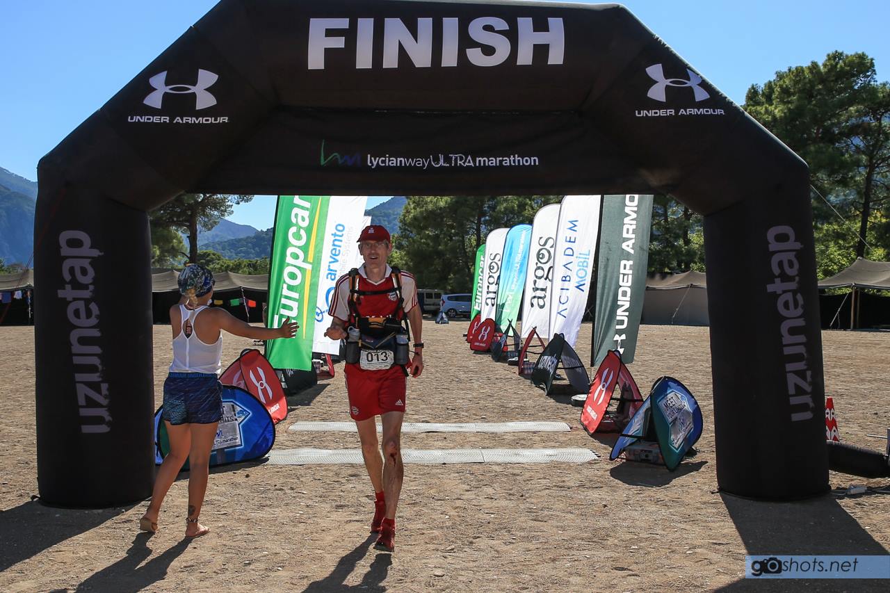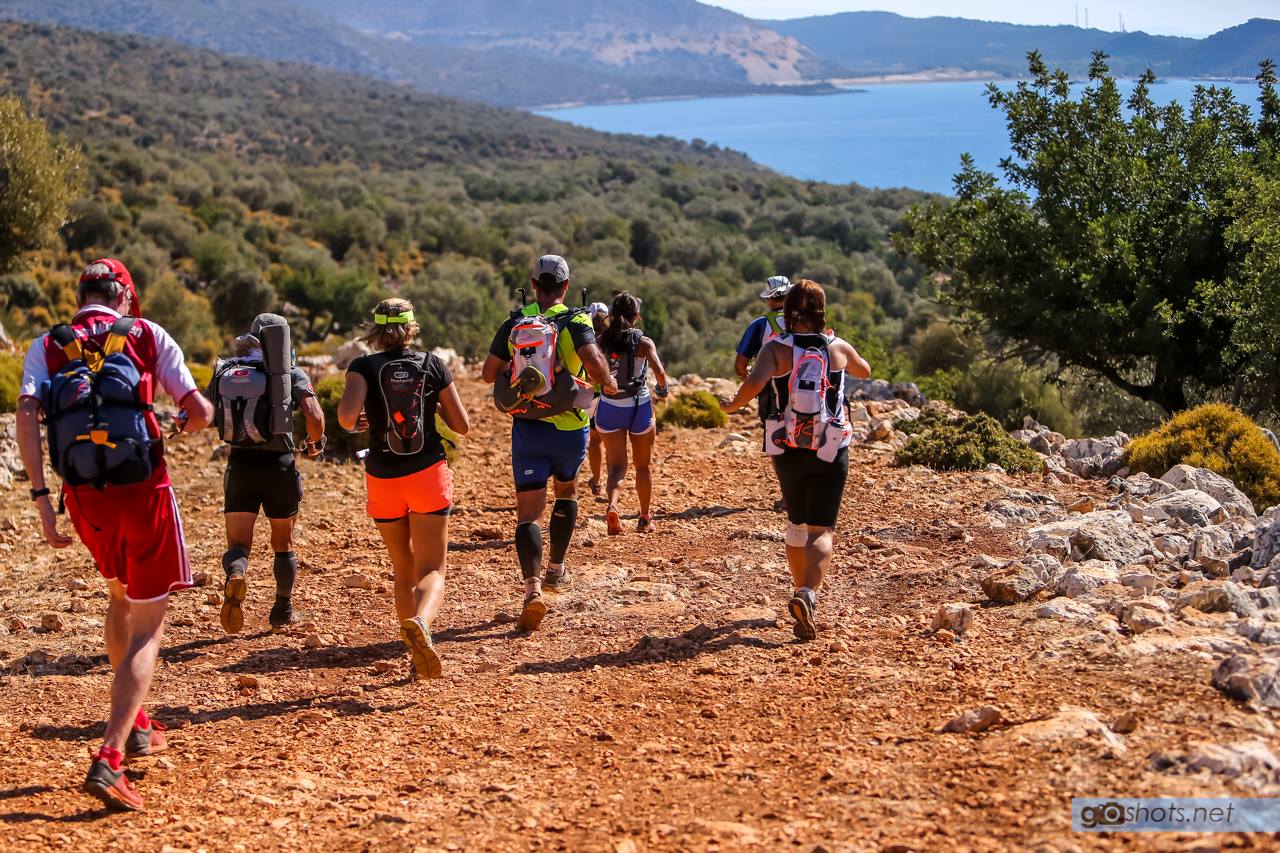 Um kurz nach 6:00 Uhr ist der Start für alle Kategorien, nur das über 90% nur bis km 21 laufen, der Rest bis ins Camp bei Kilometer 37,6, bzw. Kilometer 106,1. Über 700 Meter rauf und runter auf schmalen, teils ziemlich steilen Bergpfaden, das schlaucht ganz schön. Ich hänge mich an eine Gruppe und komme gut voran, bis ich an einem Stein hängenbleibe, hinklatsche und mir Knie, Ellenbogen und die rechte Hand aufscheuere. Ich bin nur froh, dass das Missgeschick nicht an einer steileren Stelle passiert ist. Am CP bei Kilometer 21 gibt es wie angekündigt nicht nur Wasser, sondern für jeden eine Dose Cola. Ein Traum nach 5 Tagen. Dafür nehme ich mir zwei Minuten Zeit und trinke sie in aller Ruhe am CP. Nach ein paar Kilometern geht es in 7 km von fast 0 auf 650 Meter Höhe und danach auf ähnlich unmöglichen Bergpfaden wieder runter. Danach noch 2-3 km am Strand entlang und das wieder super schön gelegene Camp in Cirali ist erreicht. Immer wenn jemand ins Ziel kommt, kommen einige Helfer zusammen und machen Stimmung. Das ist nett. Gegen Abend bringt noch jemand eine leckere Schokoladentorte am Ultramarathonläuferzelt vobei. Zusätzlich gibt es noch eine Cola für jeden. Das ist ja wie Weihnachten, aber da hatte wohl evtl. nur jemand Geburtstag. Später gibt es dann noch für jeden einen Granatapfel, die hier gerade reif sind. |