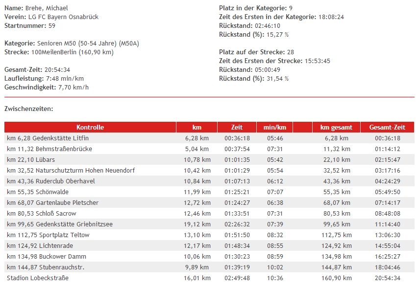 Da ich vom letzten 100 Meilen Lauf aus 2011 noch weiß, dass es als Nächstes an der East Side Gallery vorbei gehen muss, frage ich einen Taxifahrer nach dem Weg. Dort angekommen gibt es auch wieder ausreichend viele Markierungspfeile. Da es nun schon gegen drei Uhr geht, muss man noch am Ende ein wenig Gas geben, damit wenigstens die 21 Stunden Marke nicht überschritten wird, was dann schließlich noch knapp gelingt.
