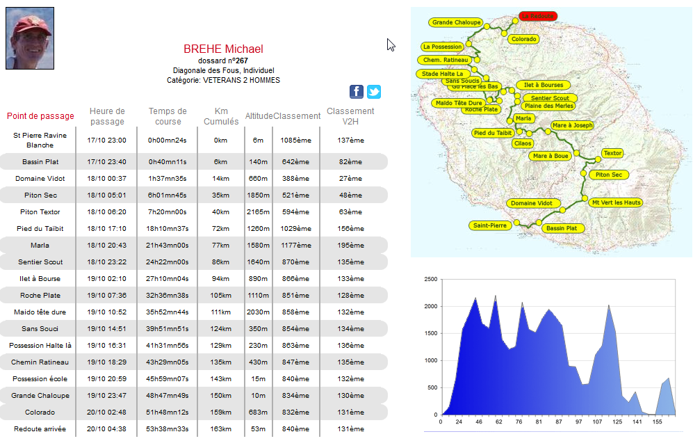 Schon nach einem gut einem Drittel der Strecke in Cilaos habe ich wirklich die Faxen dicke. Immer das Gleiche. Schwierigste Strecke, rauf und runter, nie ein Stück zum Ausruhen. Das ist unheimlich kräftezehrend und vor allen Dingen zeitraubend. Hier in Cilaos bei km 65 ist ein großer Checkpoint im örtlichen Stadion. Man erhält dort ggf. seinen "Assistance Sac", es gibt warmes Essen, man kann duschen (wer macht das denn?) und/oder sich in einem großen Zelt mit Liegen und Decken zur Ruhe begeben. Als ich dort ankomme, ich glaube es war gegen 13:00 Uhr, bin ich wenig begeistert. Es ist erst ein gutes Drittel geschafft und ich bin schon ziemlich kaputt. Ich beschließe mich für 10 Minuten hinzulegen. Nach 40 Minuten schrecke ich hoch. Mist, verschlafen. Ich muss mich doch auch noch fertig machen und mal was essen usw.. Jetzt aber hopp. Mit einer neuen FC Bayern Garnitur, frisch geputzten Füßen und neuen Socken verlasse ich nach 1,5 Stunden den Checkpoint. Eines ist klar. Der Spaß bleibt bei Langlaufveranstaltungen nach mehr als 10 Stunden irgendwo auf der Strecke. Jedenfalls ist das bei mir oft so. Spaß macht es lediglich, wenn man merkt, dass man es wieder schafft seinen eigenen Schweinehund zu überwinden, dass man weiter macht, auch wenn man keine Lust mehr hat und wenn man dann daraufhin sein persönliches Ziel oder überhaupt das Ziel erreicht. Wenn dieses Ziel aber noch ca. 40 Stunden entfernt ist, fällt es nicht immer leicht, die Stimmung hoch zu halten. Und heute scheint es ganz besonders schlimm zu sein. Irgendwie schaffe ich es nicht, meinen Frieden mit dieser Strecke zu schließen. Ich denke oft, dass der kommende Samstag bestimmt ganz grausam werden wird. Aber deshalb aufhören? Never! Der nächste Sonntag kommt bestimmt und dann ist es geschafft. Aber im Moment ist es leider erst Freitag. Mit den Zeitmessungen gibt es (bei mir) von Anfang an Probleme. Fast immer musste meine Nummer manuell aufgeschrieben oder per Hand in den Scanner eingetippert werden. Nur zweimal konnten die Klarschriftscanner an den Checkpoints meine Nummer automatisch erfassen. Vermutlich aus dem Grund fehlten dann in der Folge bei mir leider einige Zwischenzeiten, was dann Zuhause für etwas Beunruhigung sorgte. Irgendwann in der Nacht zum Samstag muss ein paar Meter breiter Bach überquert werden. Beim Rüberspringen glitsche ich aus und meine Wasserflasche rutscht aus der Fahrradflaschenhalterung an meinem Rucksack. Gerade noch so eben kann ich sie festhalten. Puuh, um ein Haar wäre sie den angrenzenden Miniwasserfall heruntergerutscht und ich hätte sie wohl kaum wiederbekommen. Leider verstauche ich mir dabei aber meinen rechten Daumen. Das ist recht unangenehm und ich weiß noch nicht, wie ich damit in den nächsten zig Stunden die vielen sehr steilen Bergauf- und Bergabpassagen bewältigen soll. Ca. zwei Stunden später, ich bin zu meinem Glück gerade auf einem ausnahmsweise mal nicht ganz so steilen Bergabstück unterwegs, übersehe ich eine Wurzel oder einen Stein und überschlage mich richtig zünftig. Gott sei Dank, alles ist in Ordnung. Nur eine Abschürfung am linken Knie, an beiden Händen, einen blutigen rechten und einen verstauchten linken Daumen habe ich davongetragen. Das ist jetzt natürlich doppelt ungünstig, mit zwei verstauchten Daumen. Ich denke, dass wahrscheinlich wohl nichts gebrochen sein wird, ich aber ja so oder so bis ins Ziel in Saint-Denis nichts dran ändern kann. Beim nächsten Checkpoint sind Matten zum Ausruhen ausgelegt. Dort lege ich eine 10-minütige Schlafpause ein. Geweckt werde ich, als eine nette Helferin mir eine Folie gegen die Kälte überlegen will. Das passt gut, denn die 10 Minuten sind sowieso rum. Ich raffe mich auf und da dort ein Sanizelt steht, frage ich kurz mal nach, ob bei meinen Daumen wohl was gebrochen ist und ob es evtl. besser wäre, den Dreck aus den Wunden zu puhlen. Die Entfernung des Drecks übernimmt dann sogar die nette Helferin. Danach schaut sich eine Ärztin noch meine Daumen an und meint, dass wohl nichts gebrochen ist. Super, eine Sorge weniger. |