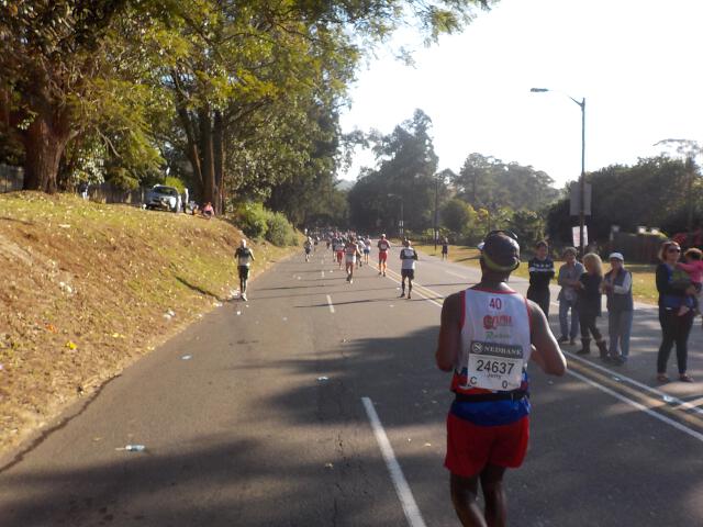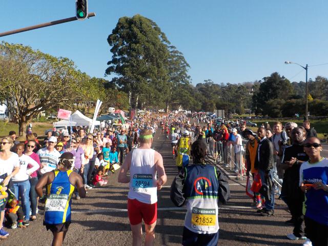 Obwohl die Straße 6-spurig ist, ist es, wie so oft zu Beginn, ein wenig drängelig. Aber schon bald hat sich das Feld auseinandergezogen, da auch die nächsten 15-20 Kilometer auf schön breiten Autobahnen gelaufen werden. Ich werde es in diesem Jahr ein wenig ruhiger angehen lassen, was mir auch schon deshalb nicht schwerfällt, da es die meiste Zeit leicht bergauf geht. Leider verpasse ich den ersten Verpflegungspunkt bei Kilometer fünf. Das ist aber zu verschmerzen, da ab jetzt ca. alle 2,5 Kilometer eine Verpflegungsstelle kommen wird. Dort werden dann jedes mal Wasser und verschiedene Isogetränke in 0,15 Liter Plastikschläuchen gereicht. Die reisst man dann mit den Zähnen auf und kann sich dann das meistens gut gekühlte Zeug einverleiben oder über den Kopf oder sonstwo hingießen. Weiterhin gibt es auch eigentlich immer Cola in kleinen Pappbechern. Mit meinem km-Schnitt um die 6 Minuten bin ich ganz zufrieden, jedenfalls wenn es bergauf geht, und das geht es meistens. Bei Kilometer 10 meldet sich mein Problemfuß mit einem leichten Ziehen. Es beunruhigt mich etwas, aber glücklicherweise wird es nicht schlimmer. Auch aufgrund der vielen Zuschauer an der Strecke und Stimmungsnestern vor und danch den Verpflegungspunkten, ist es recht kurzweilig. Bald ist der erste Marathon geschafft und dann die erste Hälfte. Es geht mir noch sehr gut, aber wie lange noch? Einen grossen Zeitpuffer konnte ich mir nicht rauslaufen und deshalb könnte die erste Schwächephase auch schon die Nichterreichung meines Zeitzieles bedeuten. Bei ca. Kilometer 55 werde ich vollkommen überraschend von dem "9-Stunden-Bus" überholt. Das ist eine, mind. 300 Läufer umfassende Gruppe, die dem 9-Stunden Pacemaker folgt. Mir war nicht bekannt, dass es hier Pacemaker gibt. Das ist jetzt ganz schlecht. Bin ich so langsam geworden? Langsam aber stetig zieht der "Bus" davon und das in einem ganz eigenartigem Stil. Sie laufen ein paar Minuten und dann geht die Gruppe wieder eine kurze Zeit. So etwas habe ich ja noch nie gesehen. Das sieht lustig aus, obwohl mir nicht zum Lachen zumute ist. Im Gegenteil, das deprimiert mich ein wenig, dachte ich doch bisher, dass ich eigentlich noch in der Zeit bin, sofern ich keine Pausen einlege. Mitten in einer Depri-Phase denke ich, dass ich ja den vor mir liegenden Hügel auch mal ein kurzes Stück hochgehen könnte, schließlich machen das die anderen Läufer ja auch und die 9-Stunden kann ich vermutlich auch nicht mehr schaffen. Als ich gerade in eine kurze Marschierphase übergehen will merke ich, dass ich einen Krampf im Unterschenkel bekommen könnte wenn ich noch langsamer werde. Da ich das Risiko nicht eingehen möchte, beschließe ich einfach weiter zu laufen. Es sind aber noch über 30 Kilometer. Ob ich das auch bis zum Ende durchhalten kann? Das ist doch mehr als fraglich. Noch 20 Kilometer bis zum Ziel. Bis jetzt habe ich durchgehalten. Fotos mache ich keine mehr. Ich muss mich konzentrieren und schauen, dass ich an den Verpflegungsstellen immer alles schnell grapschen kann was ich benötige. Das sind 2 bis 3 Wasserschläuche, evtl. noch einen Isoschlauch und immer einen Becher Cola um den Magen zu beruhigen. Immer mal wieder nehme ich auch Apfelsinenstückchen. Am liebsten die Gesalzenen. Die gibt es glaube ich nur hier beim Comrades. Auch die gekochten und gesalzenen Kartoffeln sind eine Comrades Spezialität und durchaus zu empfehlen, wenn man sie runter bekommt. Viele Zuschauer beschränken sich nicht nur auf das Anfeuern der Teilnehmer mit Namen oder Vereinsnamen, sondern betätigen sich auch als inoffizielle Supporter indem sie Salz, Kekse und andere Kleinigkeiten anbieten. Der Comrades ist nicht nur der größte Ultramarathon weltweit, sondern auch einer der Läufe mit der besten Stimmung an der Strecke. Das gute Wetter heute, mit ca. 30 Grad im südafrikanischen Winter, hilft da sicherlich auch. Mir wären ein paar Grad weniger aber vermutlich lieber gewesen. Um Kilometer 75 sehe ich wieder den 9-Stunden-Bus vor mir. Ich merke, dass ich langsam aber sicher auf die Gruppe auflaufe. Bin ich schneller geworden oder die langsamer? Keine Ahnung. Ist mir auch egal. Jedenfalls lege ich weiterhin keinerlei Gehpausen ein. Kurze Zeit später habe ich die Gruppe eingeholt und da sie mega penetrant die gesamte Breite der zweispurigen Straße versperren, muss ich auf den Randstreifen in den Dreck ausweichen um vorbei zu kommen. Mir ist klar, dass ich die 9-Stunden Marke nur noch schaffen kann, wenn ich in meinem jetzigen Tempo weiterlaufe und keine Gehpausen mehr einlege. Aber dann ist es machbar! Von daher wundere ich mich ein wenig über das Tempo vom 9-Stunden-Bus. Weiter geht es. Die letzten schwierigen Hügel bei "Polly Shortts", um die 10 Kilometer vor dem Ziel. Mehrere Kilometer zünftig bergauf. Alle gehen, ich laufe. Wenn ich die Hügel ohne zu schwächeln hochkomme, hab' ich's. Meine Beine merke ich schon lange nicht mehr. Keine Schmerzen, kein garnichts. Alle Wehwehchen rausgelaufen. Zwar schweinelangsam, aber das reicht um einen nach dem anderen zu überholen. Aber das ist ja egal. Mir geht es nur um die Sekunden die ich damit gutmache. Ich bin oben. Ja!! Nur noch läppische 5 Kilometer. Jetzt kann nichts mehr passieren. Für jeden Kilometer habe ich noch bestimmt sieben Minuten übrig. Das ist lachhaft. Die "Bill Rowan Medaille", für eine Zeit unter 9 Stunden, ist mir sicher. Ich werde ein ganz klein wenig euphorisch. Jetzt habe ich auch wieder Zeit und Muße ein paar Bilder zu machen. Pietermaritzburg ist erreicht. Drei Kilometer noch. Nur eine mickrige Waldrunde durch den Hörner Bruch. Zwei Kilometer. Der letzte Kilometer. Rein ins Stadion. Noch eine wunderbare halbe Runde und dann durch's Ziel.