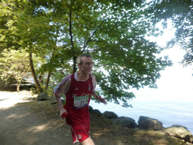 Am Strand von Gozzano (Lido de Gozzano) wird eine Startlinie in den Sand gezogen und fast pünktlich erfolgt der Start. Im Uhrzeigersinn geht es am westlichen Ufer des Ortasees entlang. Der erste Kilometer führt über einen Waldweg mit losem Schotter. Nach 1,5 Kilometer ist das erste, 1,5 Kilometer lange Straßenstück erreicht. Dann nochmal 1,5 Kilometer auf einem schönen, teilweise schattigen Pfad am See entlang und ab Kilometer 4,5 geht es dann nur noch über Asphalt oder gepflasterte Wege und Straßen. Bei Kilometer 5 gibt es einen gut ausgestatteten Verpflegungspunkt. Ich bin recht froh darüber, denn trotz der moderaten Temperatur bin schon leicht ausgedörrt und den nächsten Verpflegungspunkt gibt es erst bei Kilometer 10. Die Strecke ist insgesamt recht wellig. Drei, vier nickelige Steigungen müssen auf jedem der vier Teilstücke genommen werden. Bestzeitenfähig ist diese Strecke nicht. Bei Kilometer 10,549 geht es wieder zurück zu Start und Ziel. Mit meiner Zeit bin ich ganz zufrieden. 1:53 Stunden für den Halbmarathon ist ok und hoffentlich nicht zu schnell.