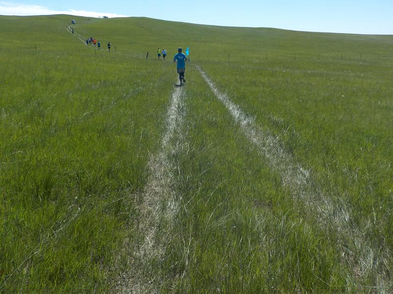 Pünktlich um 7:00 Uhr gibt es einen Start. Einen Start deshalb, weil das nicht der richtige Start ist. Der erfolgt fliegend, nach Überquerung einer weiteren Zeitnehmermatte, nachdem man die Hauptstraße, fast bis zu meinem Hotel, zurückgelaufen ist. Nach zwei, drei weiteren Kilometern ist dann aber endlich das Grassland erreicht. Zunächst geht es einen fetten Hügel hoch. Ob ich heute unter vier Stunden bleiben kann? Mal schauen. Das wäre jedenfalls ein super Ergebnis bei der Strecke.
