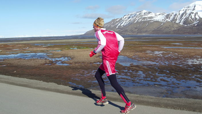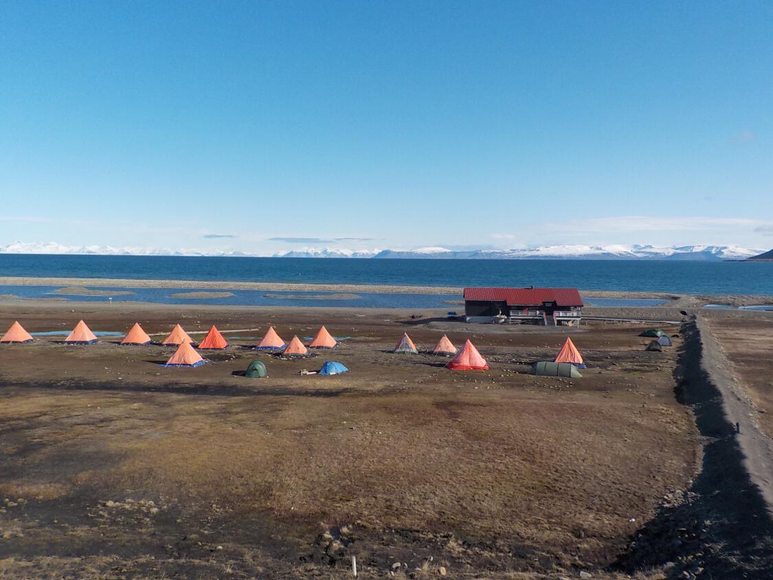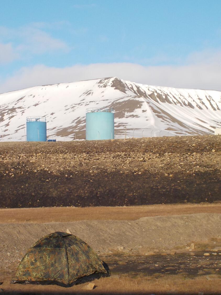 Gegen 1: 00 Uhr ist Longyearbyen erreicht. Es ist taghell. Vom Flughafen bis zum Campingplatz sind es höchstens 300 Meter. Die Temperaturen gehen gegen null. Es ist kalt und windig. Ich baue Michels Flohmarktzelt auf und pumpe meine Mini Reiseluftmatratze auf. Leider sind von sechs Luftkammern zwei defekt. Hätte ich halt, nach jahrelanger Nichtbenutzung, vorher mal ausprobieren sollen, das Teil. Um 2:00 Uhr ist alles bereitet und ich versuche ein wenig zu schlafen, was bei der Helligkeit aber nicht so einfach ist. 7:00 Uhr aufstehen. Im Funktionsgebäude vom Campingplatz ist ein Aufenthaltsraum mit Küche. Dort finde ich noch alte "Heisse Tasse" Suppen, Knäckebrot und ein paar Teebeutel. Damit ist das Frühstück auch gesichert, denn leider hatte ich mir nichts mitgenommen. Um 8 Uhr mache ich mich mit einem schwedischen Kollegen, der wohl wegen der Eisbären nicht alleine gehen mag, auf den Weg . Nach knapp 5 Kilometern ist der Start an den "Svalbardhallen" in Longyearbyen erreicht. Noch eine gute halbe Stunde bis zum Start.