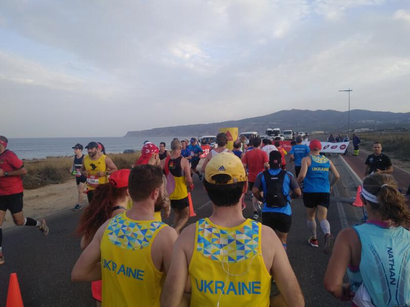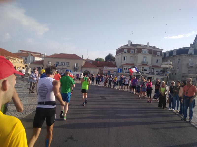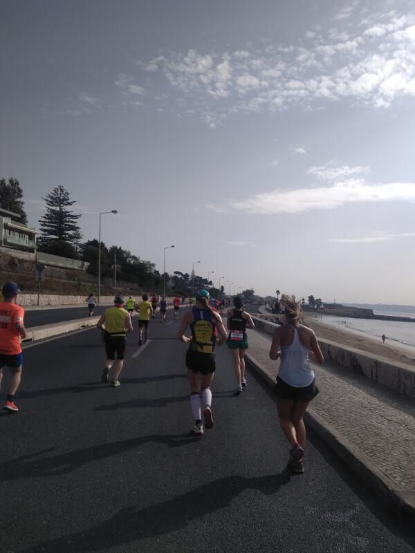 Am Nachmittag und Abend werden dann aber trotzdem noch einige Sehenswürdigkeiten weggemacht. Als ich mich um kurz nach 6 Uhr auf den Weg zum Bahnhof Cais do Sodre mache, kommt mir ein angenehmes, laues Lüftchen entgegen. Es sind bestimmt schon 20 Grad, was bedeutet, dass es beim heutigen Lauf richtig mollig werden wird. Als ich nach 15 Minuten am Bahnhof ankomme, ist der 6:30 Uhr Zug schon pickepacke voll. Überall sitzen die Leute schon auf dem Boden, nur im allerletzten Wagon sind Gott sei Dank noch ein paar Plätze frei. Glück gehabt. Um 7:10 Uhr ist Cascais, ein Vorort von Lissabon, erreicht. Nun nochmal ein 15-minütiger Fußmarsch und das Startgelände ist erreicht. Da vor den Dixis lange Schlangen sind, reihe ich mich auch sofort ein, damit ich eventuell doch noch rechtzeitig fertig werde. Bei der Warterei treffe ich auf Wolfgang Bernath, der auch mal wieder unterwegs ist und für marathon4you einen Bericht schreibt. Just in time, 5 Minuten vor dem Start um 8 Uhr, stehe ich im Startblock. Zunächst geht es in die "falsche" Richtung. Nach 6,5 Kilometern, eine 180 Grad Wende und dann zurück nach Lissabon, immer an der Küste entlang. Nach 16 Kilometer sehe ich, dass gerade jemand eines der wenigen Dixis an der Strecke verlässt. Das ist Glück. Mehr oder weniger prophylaktisch lege ich eine entsprechende Pause ein und verliere 2 Minuten. Ansonsten bin ich aber gut unterwegs, denn meine Zeiten haben sich auf gleichmäßige 5:30 Minuten/km eingependelt. Damit kann ich, nach dem schweren Trail-Marathon am letzten Sonntag, gut leben. So langsam wird es aber richtig warm und Schatten ist auch kaum vorhanden. Ich bin froh, dass ich am Start ein Käppi vom Hauptsponsor mitgenommen habe, denn seit der Wende bei Kilometer 6,5, kommt die pralle Sonne nur von vorne und blendet ziemlich unangenehm, mal abgesehen von den wenigen schattigen Stellen. Die Strecke ist eigentlich schöner als ich erwartet hatte. Man sieht einige schöne Strände, kann manchmal den Surfern in der hohen Brandung zusehen und läuft auch durch ein paar schöne Orte und an einigen Sehenswürdigkeiten vorbei. Wie fast überall gibt es aber auch hier ein paar langweiligere oder nicht so schöne Streckenabschnitte, was sich aber gut verschmerzen lässt. Sogar ein paar Steigungen sind zu bewältigen, die aber, besonders im Vergleich mit dem letzten Sonntag, ein Klacks sind. Ein Highlight sind die letzten 1,5 Kilometer bis in das Ziel auf dem Praça do Comércio. Sehr schön und stimmungsvoll gemacht, das Ganze. Mit meiner Zeit von 3:51 Stunden und ein paar Zerdrückten bin ich heute auch recht zufrieden, insbesondere auch deshalb, weil die zweite Hälfte nur unwesentlich langsamer als die Erste war.