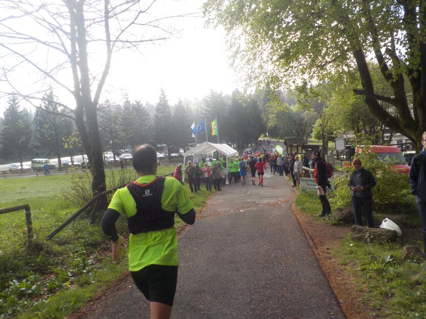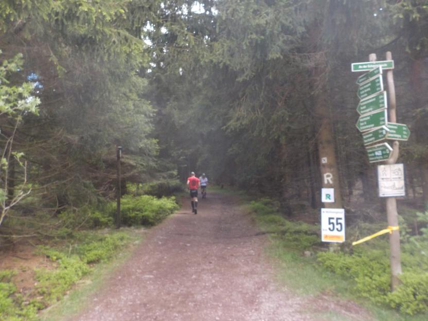 Rennsteiglauf Logo Gestern war es kalt und es hat den ganzen Tag geregnet. Heute ist es sonnig mit ein paar Wolken, bei angenehmen 12 Grad. Also perfekte Bedingungen. Wenn alles gut läuft, sollte ich evtl. heute unter 8 Stunden bleiben können. Mal schauen. Doch wichtiger ist, dass mein linkes Problemknie "hält". Noch am letzten Sonntag hatte ich so ein starkes Stechen in dem Teil, dass laufen nur schwer möglich war. Schon nach ein paar hundert Metern nach dem Start hat man Eisennach hinter sich gelassen und es geht hinein in den Thüringer Wald, auf den Rennsteig, den ersten moderaten Berg hinauf. Ca. 1900 positive Höhenmeter sind heute auf 73,5 Kilometer zu schaffen. Das ist zwar nicht schlecht, aber auch keine wirkliche Herausforderung. Gemächlich geht es voran. Jeder 5. Kilometer ist an der Strecke deutlich markiert, wobei ich jedes der 5-Kilometer-Häppchen, je nachdem wieviele Hügel dabei waren, in 30 bis 32 Minuten abarbeiten kann. Da ich heute nicht wirklich unter Zeitdruck stehe, bin ich damit auch recht zufrieden. Von der reichlichen Verpflegung an den Verpflegungsstationen gefällt mir am besten der "Schleim". Haferflocken, so zu einem flüssigen Brei gemixt, dass man es noch gut trinken kann. Die Brote und anderen Leckereien lasse ich lieber liegen, denn ich will mich ja hier nicht satt essen und womöglich im Ziel schwerer sein als zu Beginn.