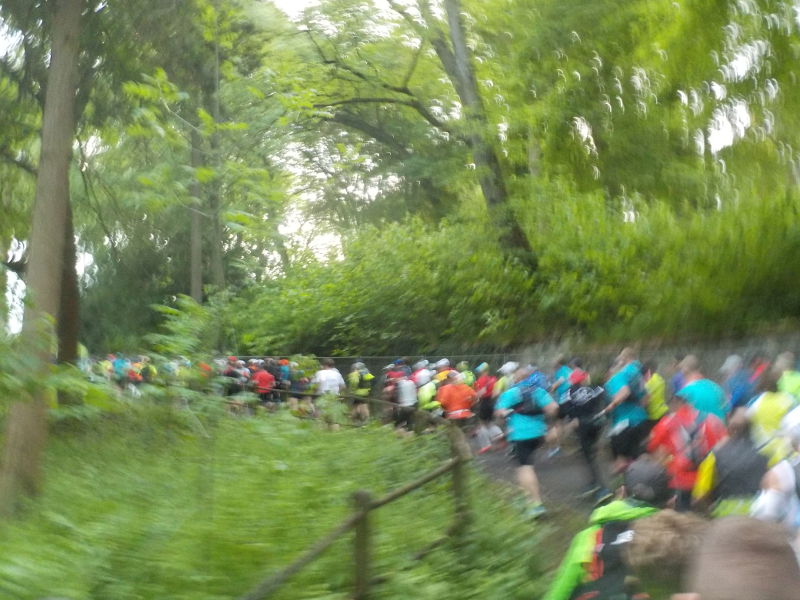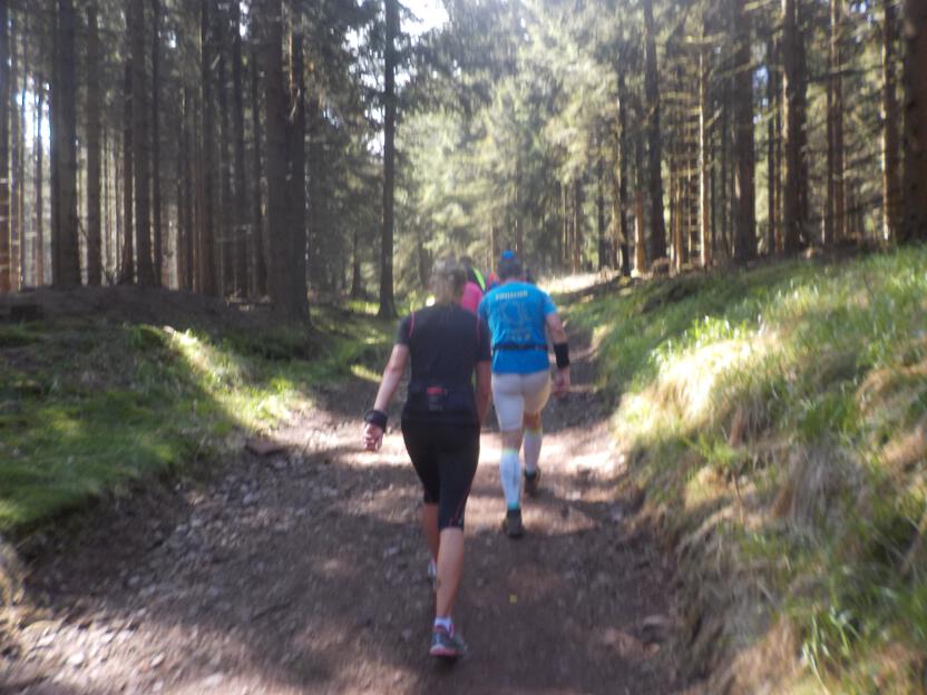Bei der Verpflegungsstation Ebertswiese komme ich schwer ins grübeln. Auf einem Schild steht, "Die Hälfte ist geschafft!!". Wenn das hier bei 37,5 km die Hälfte ist, dann wären ja insgesamt 75 und nicht 73,5 Kilometer zu laufen. Wenn das stimmt, dann wird es mit den sub acht Stunden aber richtig knapp, oder ich muss noch einen Zacken drauflegen. Ich gehe aber erstmal davon aus, dass es bei 73,5 Kilometern bleibt.