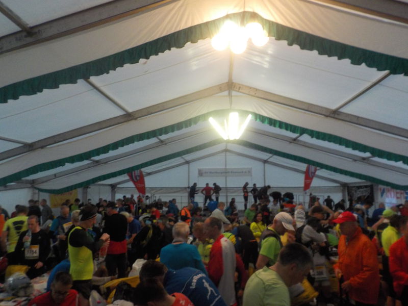 Nach drei Stunden klingelt mein Wecker. Noch 1,5 Stunden Zeit bis zum Start auf dem Markt um 6:00 Uhr. Den Wasserkocher für einen Kaffee habe ich mir gespart. Zum Frühstück gibt es eine Scheibe trockenes Brot und 0,5 Liter Wasser, bevor ich mich auf den Weg mache. Der Markt in Eisenach ist nur gute 5 Minuten entfernt. Auf dem Weg zum Start noch ein kurzer Stop zur Startnummernabholung in einer Schule, wo man auch ein Busticket für 10 Euro für die Rückfahrt mit dem Bus nach Eisenach erstehen kann. Nun bleibt noch genug Zeit für ein paar Vorbereitungen und zum Abhängen im eigens aufgebauten Festzelt.