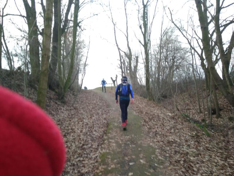 Um 5:00 Uhr beginnen die letzten Vorbereitungen, u.a. mit einem kurzen Frühstück in einer Halle vom Reiterhof. Um 6:01 Uhr dann der Start. Es geht flott los, wie ich finde, versuche aber mich nicht mitreißen zu lassen und ruhig zu bleiben. Aufgrund der vielen Stirnlampen bei den anderen Teilnehmer sieht man genug und ich kann meine Handylampe aus lassen. Da ich vor der Dunkelheit im Ziel sein werde, bzw. sein möchte, habe ich mir die Mitnahme einer extra Stirnlampe erspart. Nach einer guten Stunde ist schon der erste Checkpoint bei km 10,9 erreicht. Ich lasse mir nur ein wenig heißen Tee in meinen mitgebrachten Becher füllen und gehe rasch weiter. Die Strecke ist gut zu laufen. Kein Schnee und laue Temperaturen um den Gefrierpunkt sind perfekt für ein kleines Läufchen. Mit meinem kurzärmeligen Shirt, einem langärmeligen Bayern Trikot und einer FC Bayern Windjacke bin ich eigentlich schon zu warm angezogen, aber ich bin zu faul irgendwas auszuziehen. Ich muss ruhig laufen, damit ich nicht anfange zu schwitzen, denn dann würde es doch sehr schnell kalt und unangenehm werden.