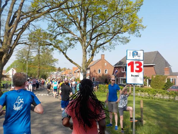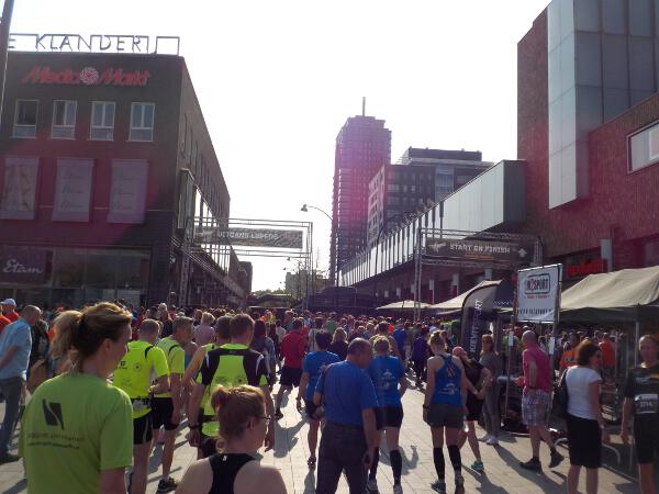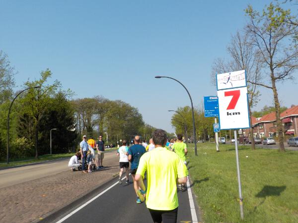 Überpünktlich, gegen 8:30 Uhr, erreiche ich das 90 Kilometer entfernte Enschede. Eine Nachmeldung sollte bis 9:00 Uhr, eine Stunde vor dem Start zum Marathon, möglich sein. Trotz Angabe der Nationalität und meines Wohnortes auf dem Nachmeldezettel, werde ich später in der Ergebnisliste als Niederländer mit Wohnort in den Niederlanden erscheinen. Da besteht eindeutig Verbesserungsbedarf bei der Datenerfassung. Ich gammel noch ein wenig herum und latsche dann zum ein Kilometer entfernten Start. Neben den ca. 850 Marathonläufern stehen auch 2900 Halbmarathonläufer an der Startlinie, wehalb es dort recht eng wird. Auch nach dem Startschuss um 10:00 Uhr zieht sich das Feld nur langsam auseinander. Insbesondere an den alle 2,5 Kilometer vorhandenen Getränkestationen ist es oft nicht so einfach, einen Becher im Vorbeilaufen zu grapschen. Aber bei den Temperaturen von sonnigen über 25 Grad ist es wichtig, keine Station auszulassen. Bis Kilometer 5 geht es auf einer abgesperrten Hauptstraße fast komplett schnurgeradeaus. Dort eine 180 Grad Wende, dann 3,5 Kilometer zurück und danach rechts ab auf eine Schleife durch die Stadtteile am Rand von Enschede. Hier und da stehen Grüppchen rum und klatschen den Läufern zu. Alle sind sehr freudlich hier. Eine sehr angenehme Atmosphäre. Ab Kilometer 18 ist man wieder in der City angelangt und man läuft die letzten Kilometer durch die abgesperrte Innenstadt/Fußgängerzone.