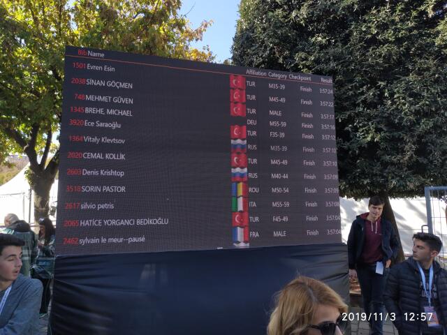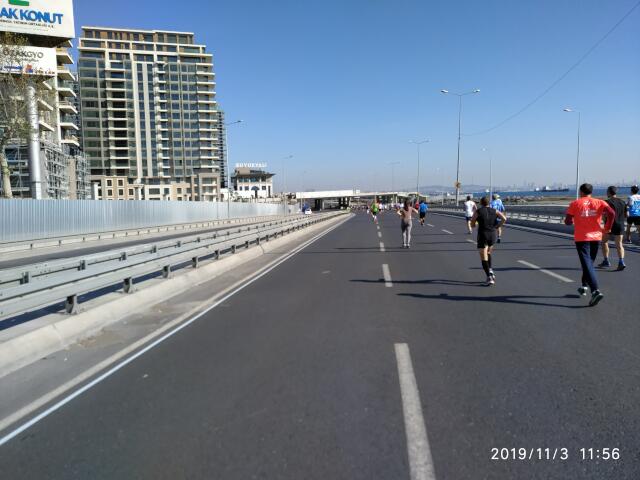 Auf der Webseite steht bezgl. des Gepäckrücktransports: "Attention: All luggage buses will be leave at 08.30." Die Gepäckbusse stehen, nach Startnummern sortiert, ordentlich aufgereiht neben den Startblöcken. Als ich und einige zig andere Teilnehmer den Beutel um 8:20 Uhr, 10 Minuten vor Abgabeschluss abgeben wollen, nimmt der Kollege plötzlich kein Gepäck mehr an. Kein gutes Zureden hilft. Die Türen werden einfach geschlossen und total hektisch fahren die Busse davon. Was war das denn? Fragend schaut man einander an und weiß nicht was das sollte. Da stehe ich nun ein wenig perplex und beschließe, dass ich dann eben mein Zeugs selber zurück schleppe. Es sind zwar nur zwei billige 5€ Teile im Beutel, aber zum wegschmeißen ist es eindeutig zu schade. Ich betrachte es einfach als kleine, zusätzliche Challenge. Zunächst geht es über die Brücke zurück nach Europa. Dann geht es von der Brücke runter und in süd-westlicher Richtung weiter, immer mehr oder weniger am Bosporus entlang durch die verschieden Stadtteile. Bei Kilometer 27 eine 180 Grad Wende und dann bis Kilometer 40 zurück bis zum Stadtteil Sultanahmet. Hier verlässt man die Küstenstraße und es geht die letzten 2 Kilometer leicht bergauf, an der Hagia Sophia vorbei, bis ins schöne Ziel vor der Sultan-Ahmet-Moschee. Nach der Rumlatscherei gestern und meinen schweren Beinen schon am Start, bin ich mir bei Kilometer 20-30 fast sicher, dass das heute nichts mit sub 4 Stunden wird, da ich dafür keine zwei Minuten mehr einbüßen darf. Irgendwie schaffe ich es dann aber trotzdem, mein Tempo zu halten, evtl. auch motiviert dadurch, dass fast alle ab Kilometer 25 langsamer werden und ich nur noch am Überholen bin. Die letzten zwei Kilometer "bergauf" sind dann auch kein Problem mehr und ich kann den Lauf, zwar relativ langsam, aber sogar mit einem leicht negativen Split, in 3:56:02 Stunden beenden.