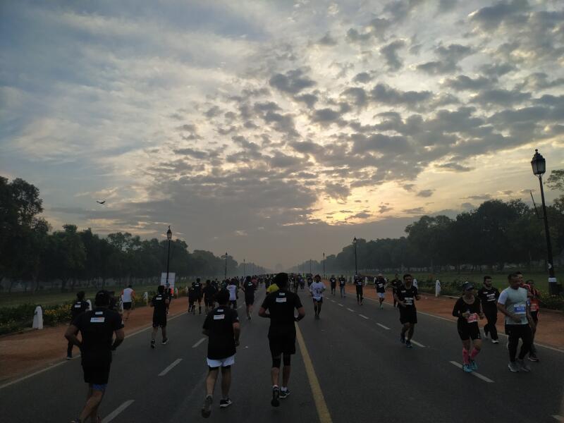Die Streckenführung ist nicht so schlecht. Auf der gesamten Strecke kommen einem ab Kilometer 8 andere Läufer entgegen, was es recht abwechslungsreich macht. Als man bei Kilometer 6,5 nach links abbiegt, sieht man rechts, in 400 Meter Entfernung, das India Gate, die top Sehenswürdigkeit in Delhi. Es geht nun auf einer zwei Kilometer langen Geraden durch den "Rajpath Sitting Park". Am Ende liegt der Präsidentenpalast, den man auf der zweiten Runde, wenn es hell geworden ist, sicher auch sehen kann. Am Ende des Parks noch eine Schleife nach links und dann geht es, mit zwei zusätzlichen Loops durch die am Park angrenzenden Stadtgebiete, wieder zurück.