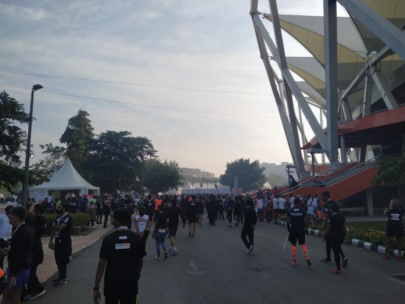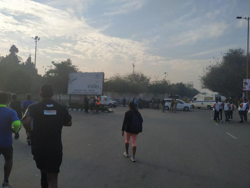 So. 24.02. Eigentlich hatte ich mich so gut vorbereitet, dass eine Zeit unter 4 Stunden locker hätte drin sein sollen. Aber nach den letzten Tagen ist es ja reines Glück (im Unglück), dass ich heute überhaupt starten kann. Und so wäre ich nun mit einem Finish, egal in welcher Zeit, zufrieden. Logo Um 2:45 Uhr gehe ich zum Start am, bzw. im 20 Gehminuten entfernten "Jawaharlal Nehru Stadium". Das war etwas zu früh, da um 3 Uhr das gesamte Stadiongelände noch abgesperrt ist. Mit etwas Verspätung werden die Teilnehmer um 3:20 Uhr auf das Stadion-/Veranstaltunsgelände gelassen. Im Moment sind es lediglich 13 Grad und zum Rumstehen ist es etwas zu kühl, weshalb ein lockeres Aufwärm-/Animationsprogramm geboten wird. Um 3:50 Uhr, 10 Minuten vor dem Start, werden die Teilnehmer dann auch an die Startlinie im Stadion gelassen. Um diese Zeit ist hier natürlich keiner, ganz anders als letztes Jahr in Pyongyang, als das Stadion "ausverkauft" war. Es ist aber trotzdem immer wieder eine schöne Sache, in einem Stadion zu starten.