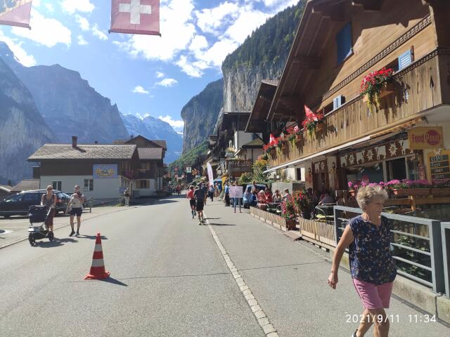 Bis Lauterbrunnen, bei Kilometer 26, war die Strecke noch recht flach. Ein paar kleinere Steigungen, klar, aber nichts was man nicht hätte laufen können. Nun wird es aber richtig steil. Auf den nächsten zwei Kilometern sind ca. 400 Meter an Höhe zu gewinnen. Das ist schon ein Wort. Keiner läuft mehr. Alles marschiert nur noch. Das sich nun etwas verändert hat sieht man auch daran, dass ab jetzt nicht mehr nur nach jedem Kilometer eine Kilometermarkerung aufgestellt ist, sondern alle 250 Meter. 14 Minuten benötige ich für den ersten steilen Kilometer. Wenn das so weiter geht, brauche ich über 6 Stunden bis ins Ziel. Ganz tolle Aussichten. Der Weg ist aber breit und man kommt an den noch langsameren Kraxlern gut vorbei. Bei Kilometer 30 ist Wengen erreicht. Hier wird nochmal ordentlich Stimmung gemacht. Was ich kaum erwartet hätte ist, dass es noch Streckenabschnitte gibt die so flach sind, dass man wieder leicht laufen kann. Aber trotzdem wird das Fortkommen zusehends schwerer. Die Beine sind teilweise wie Blei. An einem Verpflegungspunkt grapsche ich mir zwei Becher Cola und irgendwann geht es wieder einigermaßen. Lag es an der Cola? Als ich grad so denke, dass ich mich wieder gut fühle, ich gut voran komme und ich es evtl. doch noch unter 5 Stunden ins Ziel schaffen könnte, geht es bei Kilometer 39 einen schmalen Single-Trail-Pfad steil nach oben. Zusätzlich laden viele Wurzeln und Felsen zum Marschieren ein. Mist! Und auch wenn man schneller könnte, überholen geht hier kaum. Schnell muss ich mich damit abfinden, dass das mit den sub 5-Stunden nichts mehr wird. Auf den nächsten drei Kilometern geht es noch mühsame und kräftezehrende 450 Meter bergauf. Endlich kommt die Bergstation des Eigergletschers in Sicht. Als es 200 Meter vor dem Ziel nur noch leicht bergauf geht, verzichte ich auf einen "Zielsprint". Das wäre albern. Ein lockerer Trab ins Ziel muss reichen. 5:18:49. Na ja, das geht so irgendwie. Nach dem Zieldurchlauf geht es mir recht gut. Kein Brennen in den Beinen und außer ein wenig "Knie", keine größeren Wehwehchen. Da ich heute noch viel vor habe und es hier oben auf über 2300 Meter auch recht kühl ist, halte ich mich hier im Zielbereich nicht länger auf, sondern gehe sofort zur Seilbahn. Die bringt einen in 15 Minuten runter nach Grindelwald. Von dort weiter, in guten 30 Minuten mit dem Zug nach Wilderswil, eine Station vor Interlaken und dann noch 25 Minuten zu Fuß zum Parkplatz auf dem Flugplatz. Schnell noch eine Katzenwäsche und einen Kaffee vom Campingkocher, bevor ich mich um 17:00 Uhr auf den 800 km langen Rückweg mache. Ankunft in Osnabrück um 1:00 Uhr. |