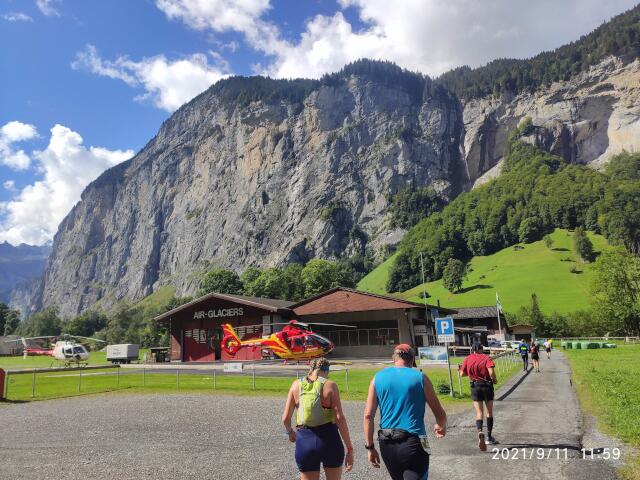 Um 10:00 Uhr mache ich mich am Freitag auf den Weg und erreiche gegen 18:30 Uhr das ca. 800 Kilometer entfernte Interlaken. Da es leider in Strömen regnet, fällt der Stadtrundgang aus. Stattdessen geht es zum Einkaufen in einen Coop und dann zum Flugplatz Interlaken. Auf der Start- und Landebahn des stillgelegten, ehemaligen Militärflugplatzes, die für den Marathon als Parkplatz genutzt wird, bin ich z.Zt. noch der Einzige. Der Start erfolgt heute in 8 Startgruppen, die ab 7:15 Uhr im halbstündigen Rythmus auf die Strecke geschickt werden. Da ich erst um 9:45 Uhr an der Reihe bin und auch die Startnummer erst jeweils eine Stunde vor dem Start abgeholt werden kann, muss ich mich nicht hetzen. Zum Startgebiet, zu dem man nur Einlass erhält wenn man eines der drei G-Kriterien erfüllt, sind es nur wenige hundert Meter. Alles ist ganz entspannt. Auch vor der Startlinie muss man, anders als vorher angekündigt, keine Narrenkappe mehr tragen. Pünktlich geht es bei bestem Wetter los. Kein Regen, ein blauer Himmel und ca. 17 Grad. Das passt.
