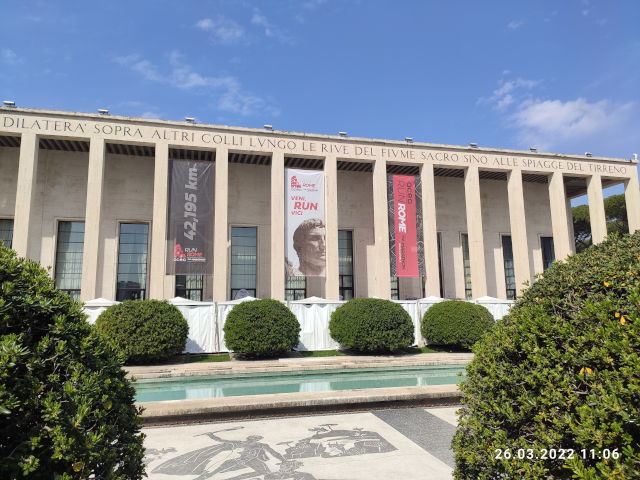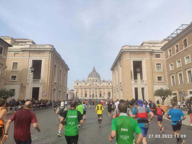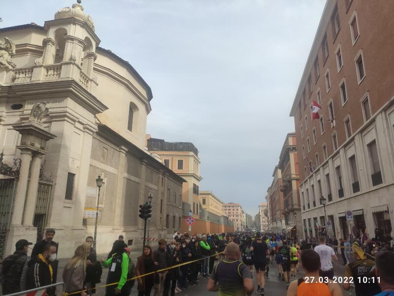 Am Samstag nach dem Frühstück, Abholung der Startunterlagen im "Salone delle Fontane", einem Veranstaltungszentrum am Stadtrand. Als Add-On gibt es auch noch die Medaille von 2020 für alle, die schon damals angemeldet waren. Danach werden, bei diversen Besichtigungen (Colosseum u.v.a.m.), noch ein paar Kilometer gefressen. Am Abend endlich mal wieder Pizza. Sonntag, endlich wieder Marathontag. Wegen der angekündigten Sicherheitskontrollen mache ich mich schon gegen 7:45 Uhr auf den Weg zum Start, der um 8:35 Uhr geplant ist. Um Eingang zum Startgebiet zu erlangen, muss ich leider erstmal halb um das Colosseum herum laufen, um den Weg dann wieder, nun innerhalb der Absperrung, zurück zu latschen.