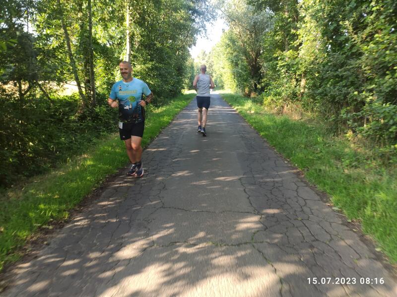 Nach einem kurzen Briefing vom Organisator Patrick, geht es pünktlich um 8:00 Uhr auf die erste Runde. Die ersten 5 Runden kann ich noch, wie geplant, recht gleichmäßig herunterlaufen. Dann wird es leider zunehmen zäher, sodass ich für jede folgende Runde ca. 1,5 Minuten länger brauche als für die Vorherige. Mir wird schnell klar, dass das so heute nix wird, mit einer Zeit unter 4:15 Stunden. Auf der vorletzten Runde verliere ich dann auch die 4:20 Stunden aus den Augen, aber zumindest die sub 4:30 Stunden will ich unbedingt noch schaffen. So bin ich dann am Ende noch einigermaßen zufrieden, als ich nach 4:24:11 Stunden durch's Ziel laufe. Dann noch ein wenig abhängen, bevor ich mich auf den 35-minütigen Rückweg mache. |