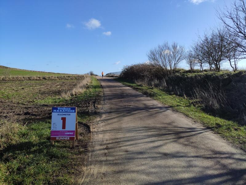 | Statt eines langen Samstaglaufes ein Wochenendtrip nach Munkwolstrup bei Flensburg zum Treßsee Marathon? Ja! Da spricht nichts dagegen. Das Konzept sagt mir auch sofort zu: Es gibt 6 verschiedene Strecken im Angebot, vom 1/6 Marathon bis zum 6/6 Marathon. Alle Strecken kosten das Gleiche, nämlich günstige 5 Euro. Dafür gibt es eine schöne Medaille, eine Startnummer per Mail zum selber ausdrucken und einen 3-Runden-Kurs der, wie sich später herausstellen sollte, perfekt markiert war. Verlaufen unmöglich. Logisch, dass es für den Preis keine Veranstalterverpflegung während des Rennens gab, aber man konnte seine Eigenverpflegung an 3 Stellen der Strecke abstellen (lassen). Das ist eine super Idee und ist mehr als ausreichend, wobei mir persönlich eine Verpflegungsstelle nach jeweils 14 Kilometern ausgereicht hat.