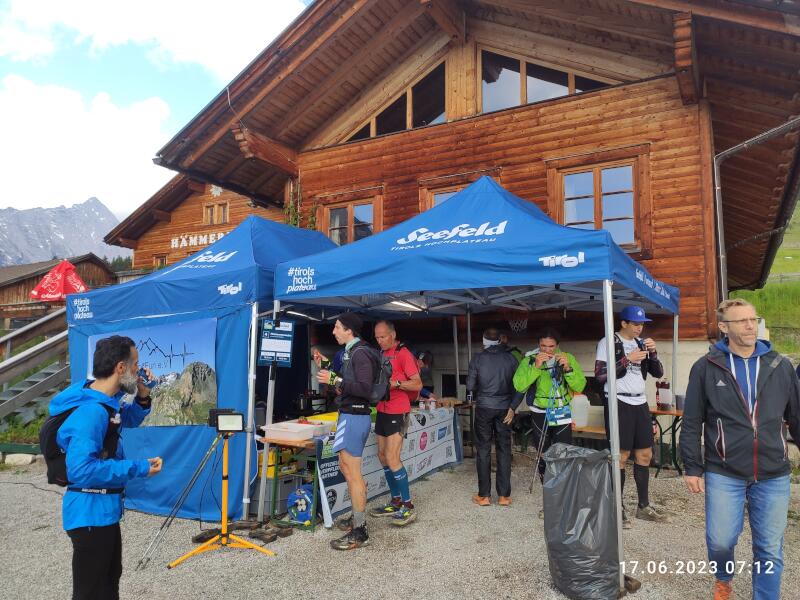 Ich wundere mich schon seit einiger Zeit, dass ich neuerdings immer mal wieder von deutlich schnelleren Läufern und Läuferinnen überholt werde. Bin ich so viel langsamer geworden? Nein. Eigentlich nicht. Es braucht einige Zeit bis ich checke, dass das die Teilnehmer vom 68 km langen Leutasch Trail sind. Die sind um 9 Uhr im Tal, in Leutasch losgelaufen und zwischen dem 4. und 5. VP auf die "normale" Strecke gestoßen. Ein wenig beruhigter geht es weiter. Es hat auch seine Vorteile, dass nun mehr Leutchen auf der Strecke sind, denn nun findet man eher immer mal wieder jemanden, mit dem man einige Minuten labern kann, um sich die Zeit zu vertreiben. Auch motiviert es zusätzlich ein wenig, wenn man oftmals mit denjenigen noch mithalten kann, die ein paar zig Kilometer weniger in den Beinen haben.